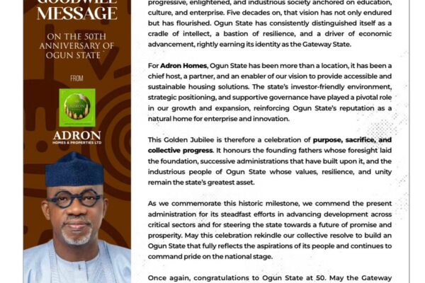 The Board of Directors, Management, and staff of Adron Group heartily congratulate His Excellency, Prince Dapo Abiodun, MFR, CON, and the good people of Ogun State as the State marks its Golden Jubilee, celebrating 50 years of progress, resilience, and development. Since its creation five decades ago, Ogun State has remained a beacon of progress,…