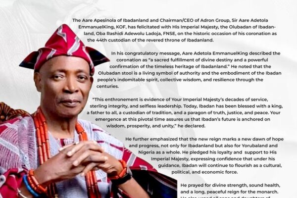 The Aare Apesinola of Ibadanland and Chairman/CEO of Adron Group, Sir Aare Adetola EmmanuelKing, KOF, has felicitated with His Imperial Majesty, the Olubadan of Ibadanland, Oba Rashidi Adewolu Ladoja, FNSE, on the historic occasion of his coronation as the 44th custodian of the revered throne of Ibadanland. In his congratulatory message, Aare Adetola EmmanuelKing described…