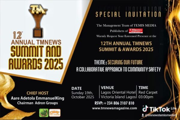 OLORUNDARE ENIMOLA, Lagos The organisers of the 12th Annual TMnews Summit & Awards has announced that the event will hold on Sunday, October 19, 2025, at the Lagos Oriental Hotel, Victoria Island. Themed: ‘Securing the Future: A Collaborative Approach to Community Safety’, will bring together ministers, security chiefs, policymakers, industry leaders, and humanitarian advocates for…
