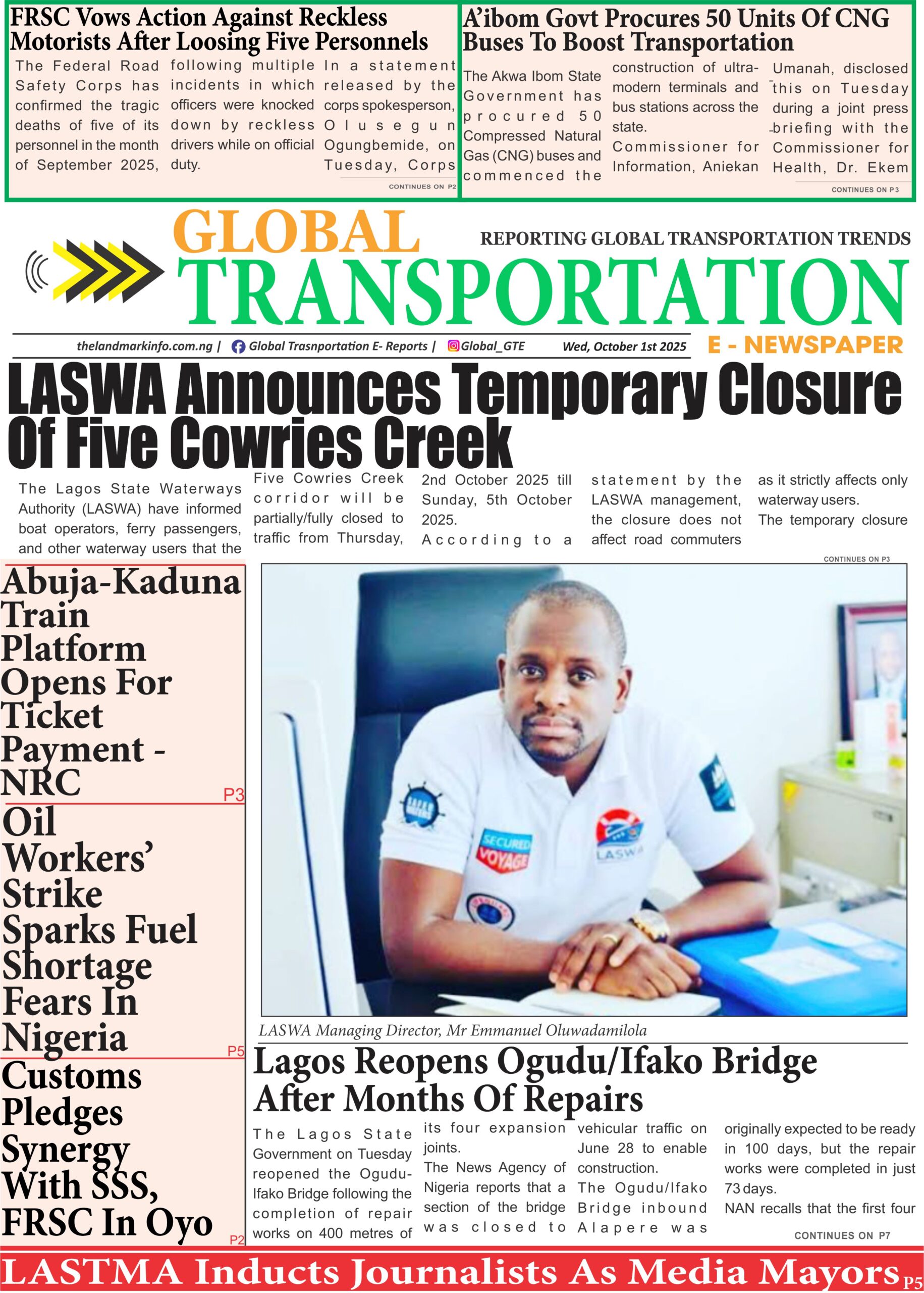 Air Logistics Maritime Road Transport SafetyGTe-Newspaper Online today (1/10/25) admin7 months ago01 mins GTe-Newspaper, Wednesday 1st of October, 2025Download Post navigation Previous: GTe-Newspaper Online today (30/9/25)Next: Lagos Reopens Ogudu/Ifako Bridge After Months Of Repairs Leave a Reply Cancel replyYour email address will not be published. Required fields are marked *Comment * Name * Email * Website Save my name, email, and website in this browser for the next time I comment.