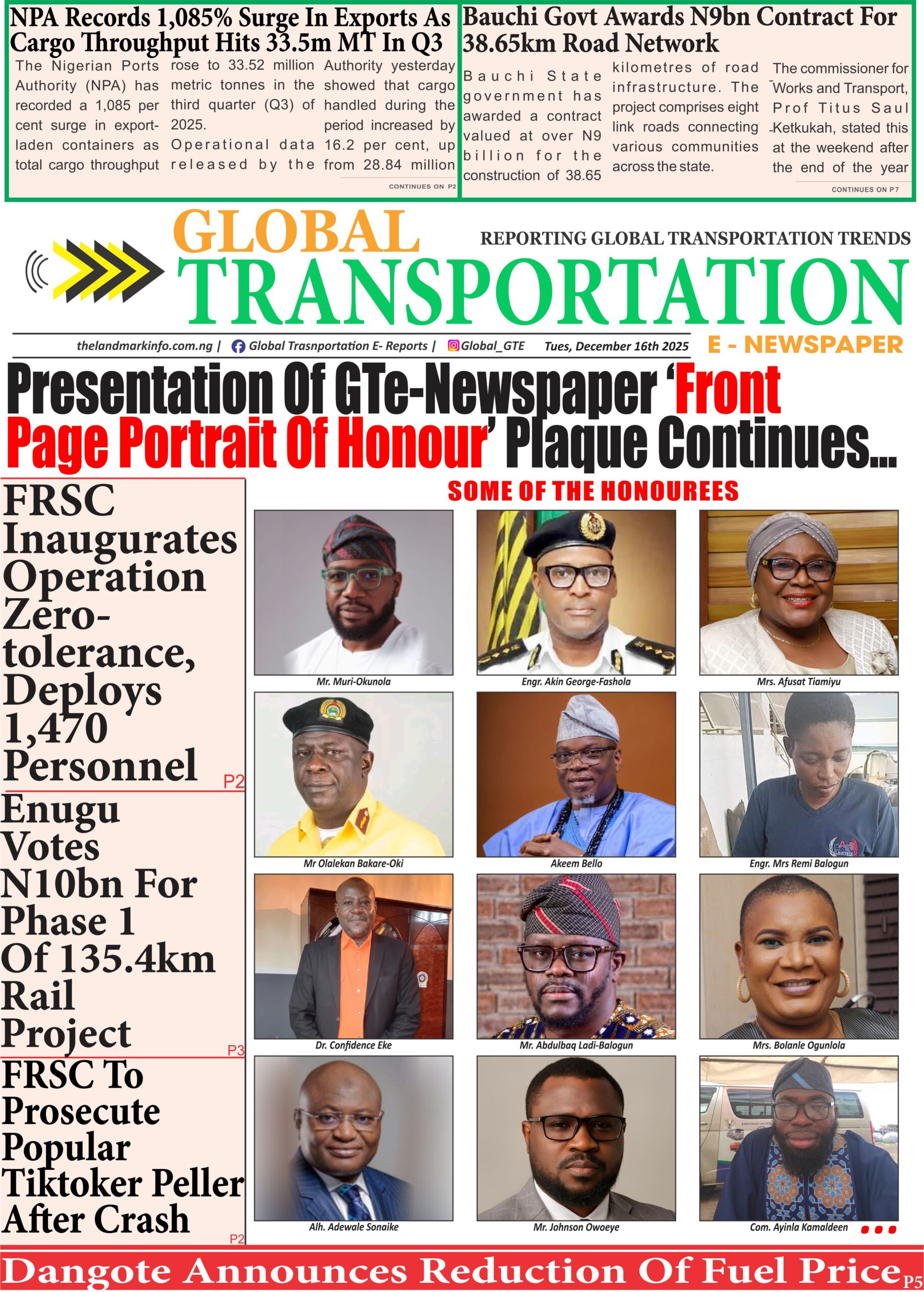 General News Maritime Road Transport SafetyGTe-Newspaper Online Today (16/12/25) admin4 months ago01 mins GTe-Newspaper, Tuesday 16th of December, 2025Download Post navigation Previous: ‘Petrol will start selling at ₦739/litre on Tuesday’: Dangote declares, vows to crash it moreNext: FRSC To Prosecute Popular Tiktoker Peller After Crash Leave a Reply Cancel replyYour email address will not be published. Required fields are marked *Comment * Name * Email * Website Save my name, email, and website in this browser for the next time I comment.