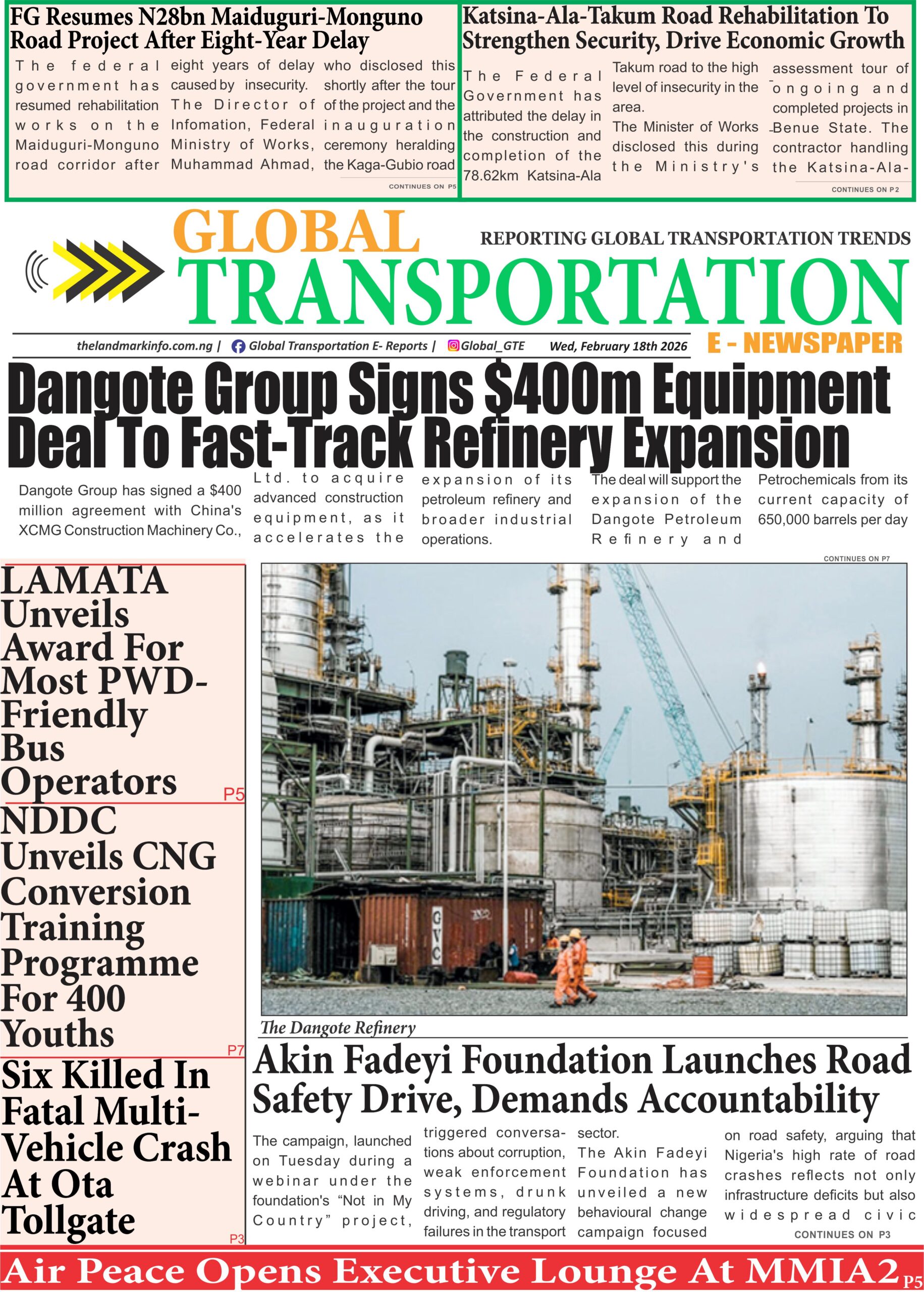 RoadGTe-Newspaper Online Today (18/2/26) admin2 months ago01 mins GTe-Newspaper, Wednesday 18th of February, 2026Download Post navigation Previous: Lagos Screens 1,000 Police Officers Under Sanwo-Olu Police Care InitiativeNext: Dangote Group Signs $400m Equipment Deal To Fast-Track Refinery Expansion Leave a Reply Cancel replyYour email address will not be published. Required fields are marked *Comment * Name * Email * Website Save my name, email, and website in this browser for the next time I comment.