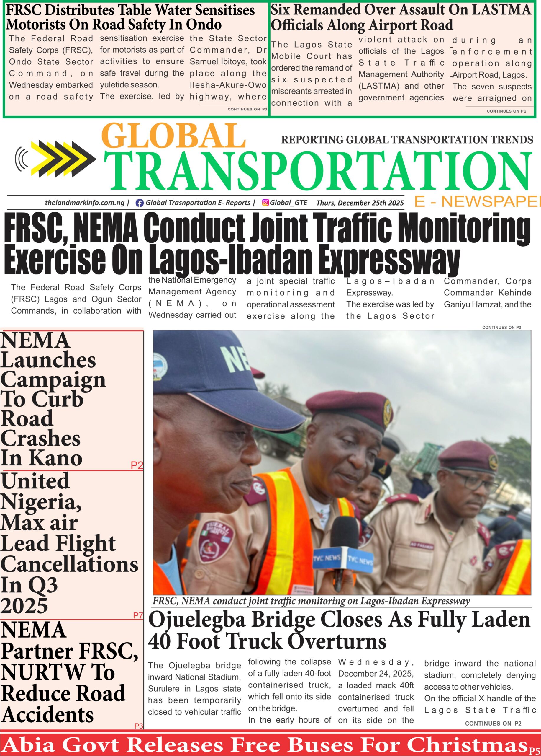 RoadGTe-Newspaper Online Today (25/12/25) admin4 months ago01 mins GTe-Newspaper, Thursday 25th of December, 2025Download Post navigation Previous: Rescue, Monitoring Team of NARTO Appreciate Stakeholders, Recounts Rescue Missions, Solicits Members’ Greater CommitmentNext: TRACE Moves Against Traffic Disorderliness, Environmental Offences At Kuto Underpass Leave a Reply Cancel replyYour email address will not be published. Required fields are marked *Comment * Name * Email * Website Save my name, email, and website in this browser for the next time I comment.