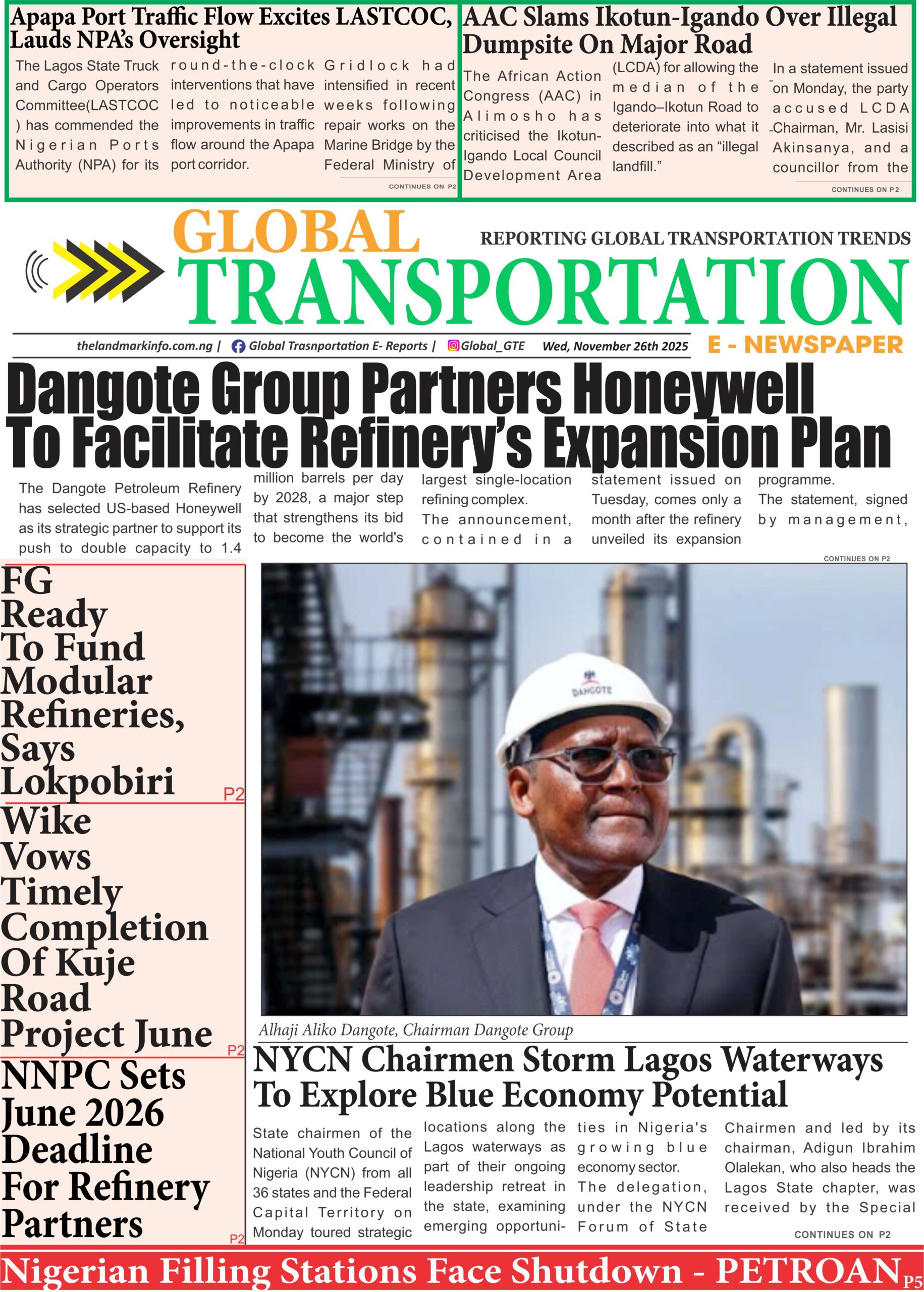 RoadGTe-Newspaper Online Today (26/11/25) admin5 months ago01 mins GTe-Newspaper, Wednesday 26th of November, 2025Download Post navigation Previous: NYCN Chairmen Storm Lagos Waterways To Explore Blue Economy PotentialNext: Ogun To Prosecute DJ Chicken Over Multiple Road Crashes Leave a Reply Cancel replyYour email address will not be published. Required fields are marked *Comment * Name * Email * Website Save my name, email, and website in this browser for the next time I comment.