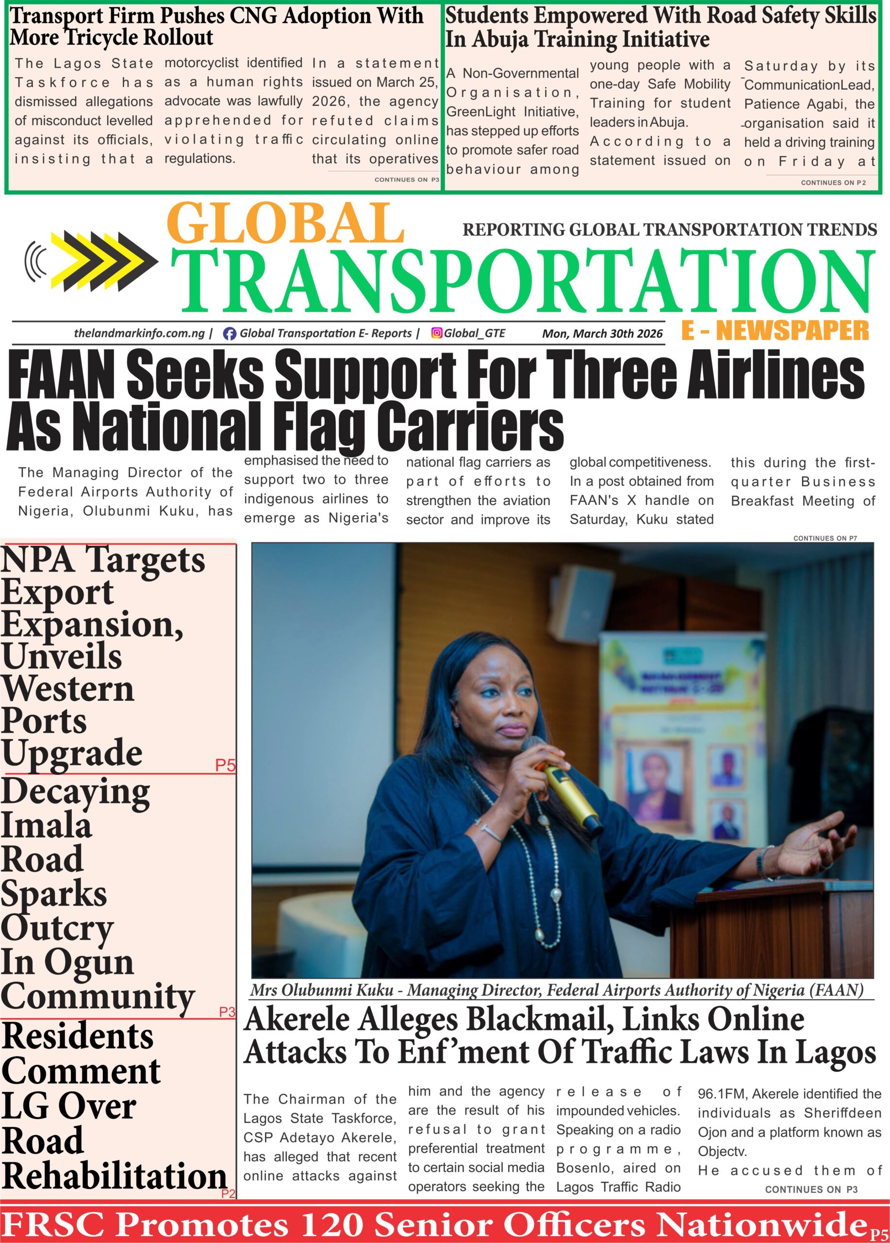 Aviation General News Maritime Railway Road Transport SafetyGTe-Newspaper Online Today (30/3/26) admin3 weeks ago01 mins GTe-Newspaper, Monday 30th of March, 2026Download Post navigation Previous: Akerele Alleges Blackmail, Links Online Attacks To Enforcement Of Traffic Laws In LagosNext: Bird Strike Disrupts United Nigeria Airlines Flight Leave a Reply Cancel replyYour email address will not be published. Required fields are marked *Comment * Name * Email * Website Save my name, email, and website in this browser for the next time I comment.